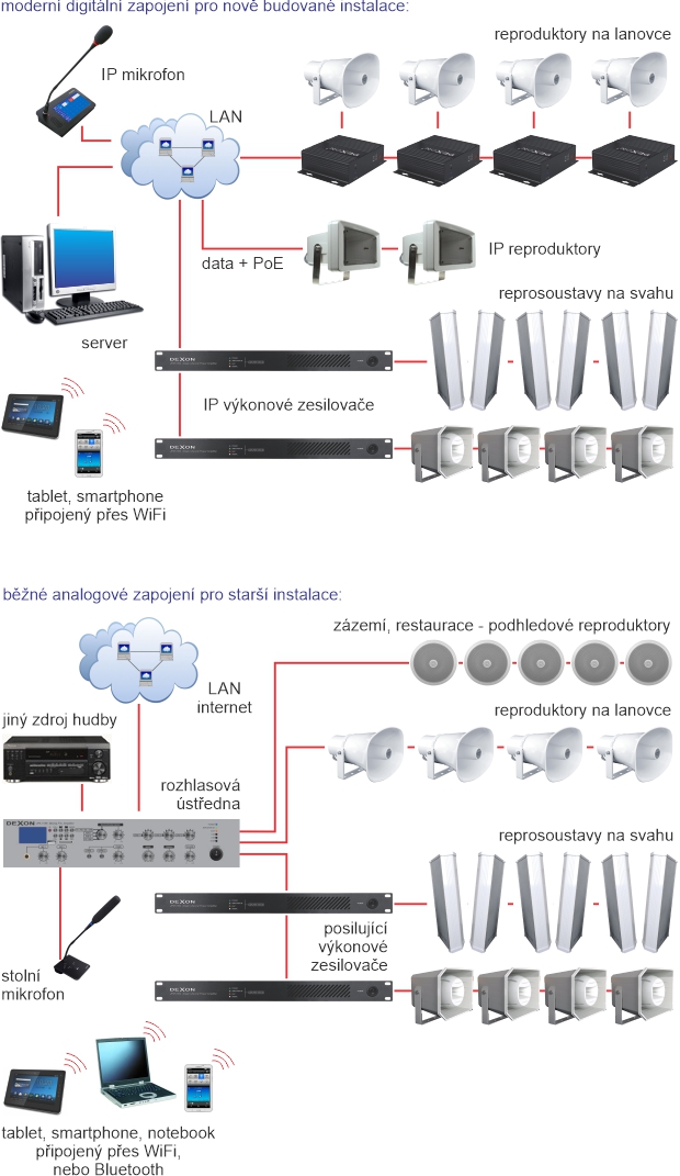 Alternativním způsobem buzení analogové reproduktorové sítě, může být použití IP rozhlas. centrály, nebo IP zesilovace z technologie IP Audio. Máme tak stanoven počítač, kde běží aplikace Dexon IP Audio Server, jež celé ozvučení plně řídí, plánuje a automatizuje. Z toho pramení výhody, které jsme popsali v předchozích odstavcích. Z IP rozhlasové ústředny, nebo IP zesilovače jdeme na reproduktorovou síť. Ústřednu můžeme doplnit, datově napojeným stolním mikrofonem PA 701, nebo PA 705. Hlásit a ovládat také můžeme z aplikace v chytrém telefonu.