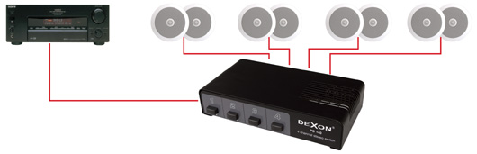 Pro ty, kteří chtějí hodně ušetřit, nemít žádný komfort ovládání a pouze reproduktory pasivně přepínat mezi sebou doporučujeme zapojení s Přepínačem reprosoustav PS 140. Jeden pár reproduktorů jsme instalovali na terasu. Přepínač nijak neupravuje a nehlídá zatížení (vzniklou impedanci) vůči receiveru. Sepnutím dvou a více reprosoustav může hrozit zničení budícího zesilovače! Např. sepnutím dvou 8 Ω reprosoustav je zesilovač zatěžován impedancí jen 4 Ω, sepnutím všech čtyř 8 Ω reprosoustav, zatěžujeme zesilovač impedancí jen 2 Ω!