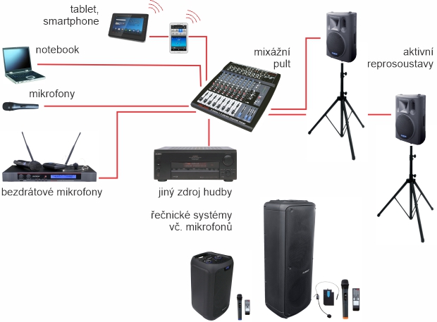 | Výkonová ozvučovací sestava osmi pasivních reprosoustav řady BC, Výkonového zesilovače DAC 2000, mixážního pultu a mikrofonní bezdrátové techniky pro firemní účely přednášek a školení. | |||