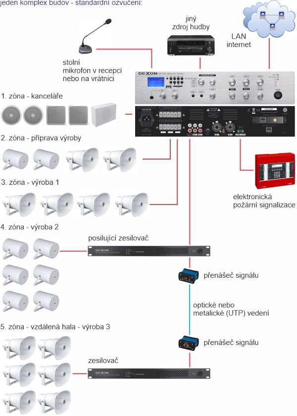 | Ozvučení výrobní firmy je realizováno prostřednictvím několika rozvaděčů, do jejich zesilovačů je audio distribuováno ve formě dat technologie Dexon IP audio. Jako reprosoustavy jsou zvoleny nástěnné typy řady SPT a reentrantní reproduktory SC. K vyhlašování je zvolen mikrofon PA 701. Ozvučení je napojeno na technologii výroby a je tak automatizováno. | |||
