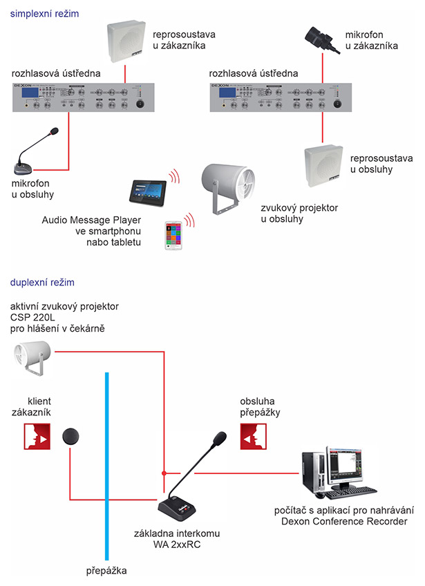 Simplexní režim od obsluhy k zákazníkovi provádíme jednoduchou a odzkoušenou kombinací stolní mikrofon PA 580 (obsahuje vypínač a mikrofon na variabilním stojánku) – malá rozhlasová ústředna JPA 3035 a reprosoustava umístěná na přepážce. Obvykle SP 442 s konzolou, ARS 190, která je miniaturní, nebo ARS 295, což je plastová skříňka. Tento systém nastavíme dostatečně srozumitelně a hlasitě, samotná přepážka (oddělení) nám napomáhá potlačovat vznik zpětné vazby.