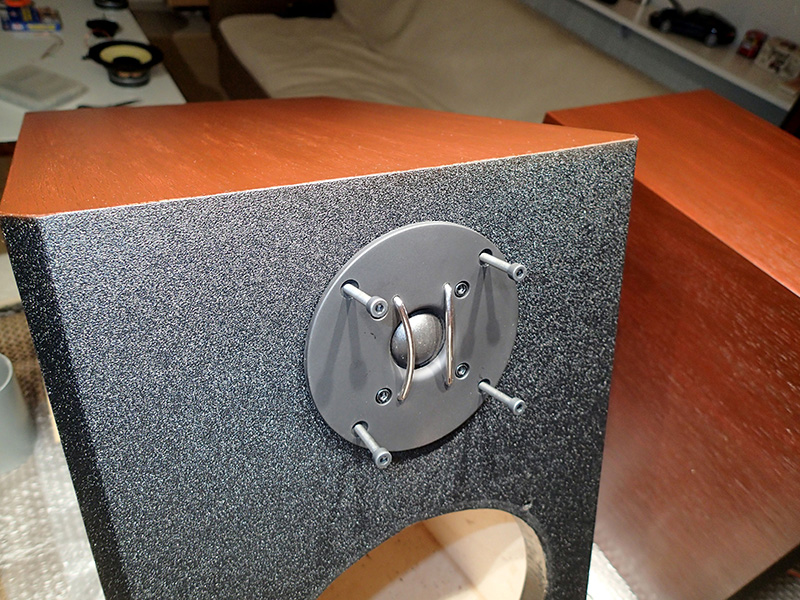 Pro skutečný efekt jsem celé soustavy kromě čel znova potáhl dubovou dýhou a opatřil kvalitní mahagonovou lazurou s obsahem vosku. Nátěr je pro svou kvalitu a design opakován celkem 3×. Reproduktory, terminály jsou samozřejmě podtěsněny upraveným těsněním, které slouží pro těsnost oken.