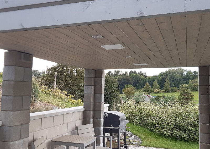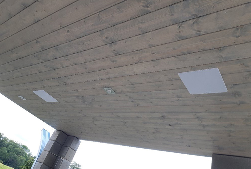 Reproduktory ze zesilovačem jsem dnes instaloval do podhledu pergoly se zelenou střechou 3 × 4m.