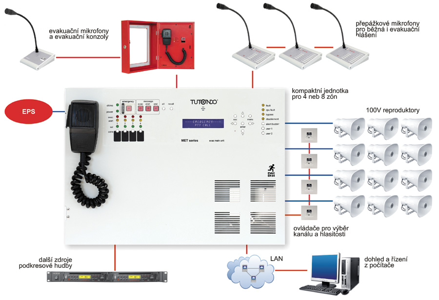 - veškerá funkčnost a připojení periférií odpovídá evakuačnímu rozhlasu Tutondo MET