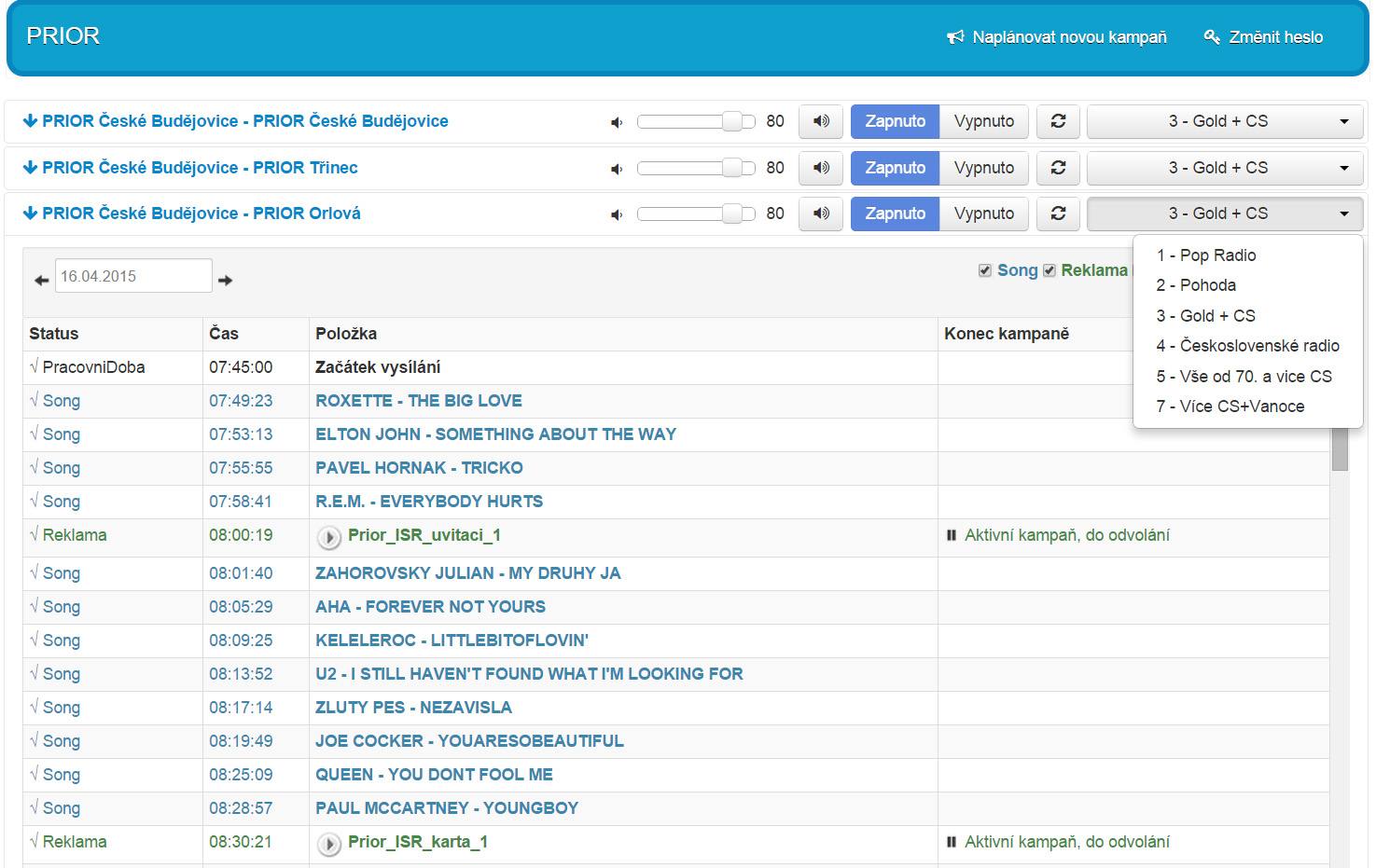 - provozovatel ve svém administrátorském webovém rozhraní „vidí“ své pobočky, aktuální i historický stav playlistu a další obsahová nastavení. Z centrály firmy tak snadno řídíte podkresovou hudbu a reklamy pro pobočky kdekoli na světě.