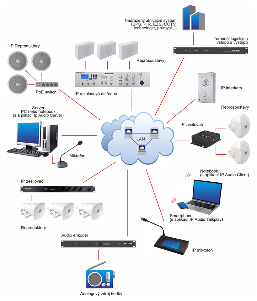 - Mozkem systému je Dexon IP Audio Server – propracovaná řídící administrátorská stále běžící aplikace.